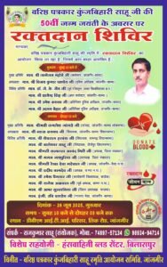 वरिष्ठ पत्रकार कुंजबिहारी साहू स्मृति आयोजन समिति के संयोजक राजकुमार साहू ने लोगों से रक्तदान करने की अपील की है.